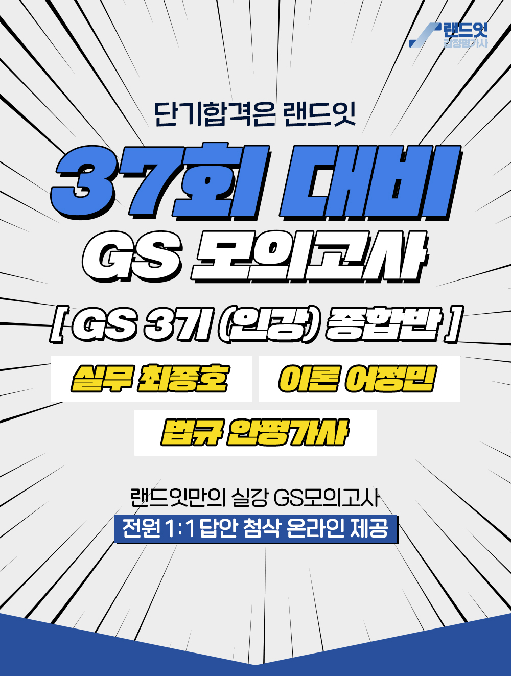 · 구성강좌 [37회][실무(최)] GS모의고사 3기 (온라인)(첨삭포함)[37회][이론(어)] GS모의고사 3기 (온라인)(첨삭포함)[37회][법규] GS모의고사 3기 (온라인)(첨삭포함)